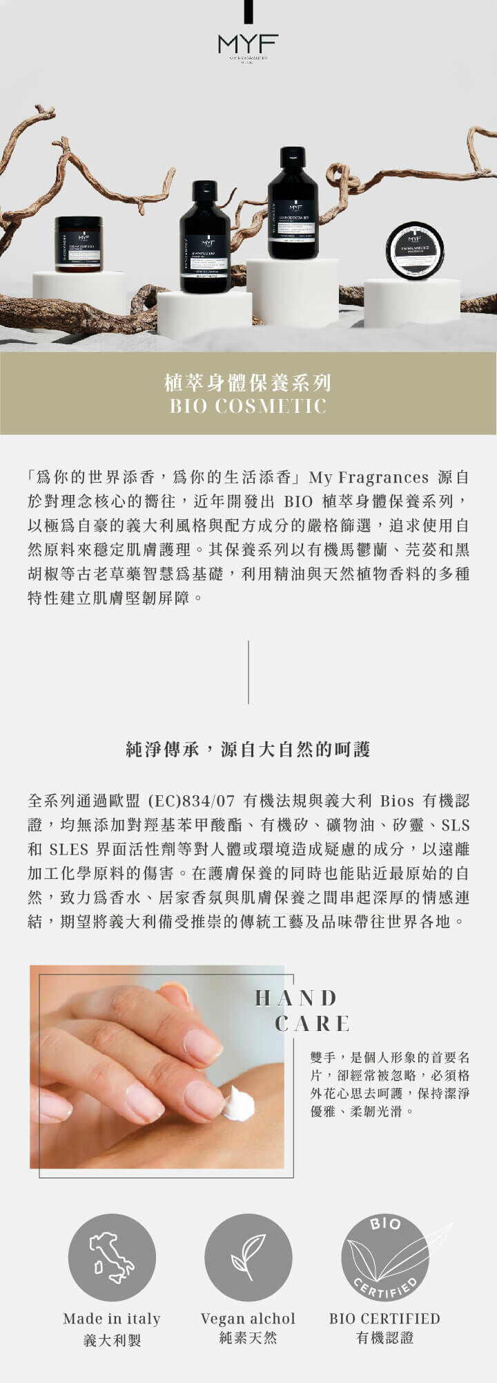 BIO植萃身體保養系列,以極為自豪的義大利風格與配方成分的嚴格篩選,追求使用自然原料來穩定肌膚護理。更以有機馬鬱蘭、芫荽和黑胡椒等古老藥草智慧為基礎,利用精油與天然植物香料的多種特性建立肌膚堅韌屏障。
