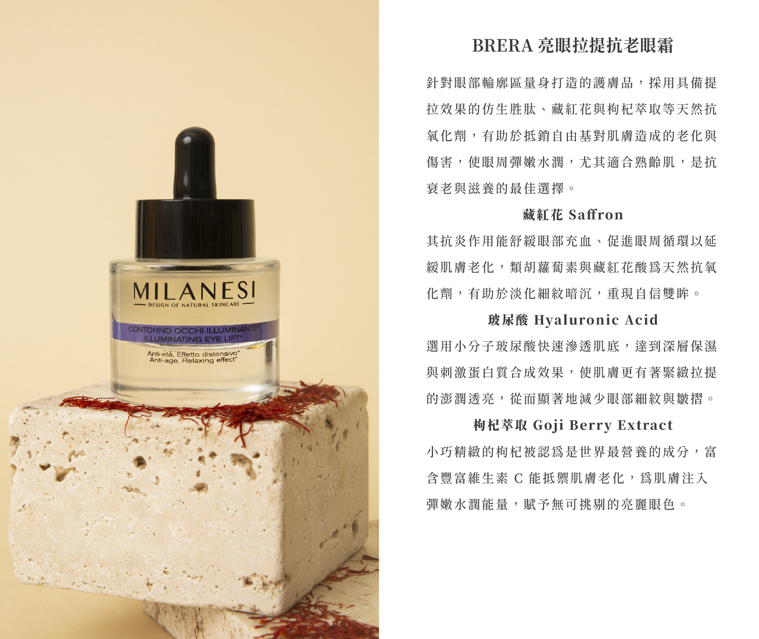 針對眼部輪廓區量身打造的護膚品,採用具備提拉效果的仿生胜肽、藏紅花與枸杞萃取等天然抗氧化劑,有助於抵銷自由基對肌膚造成的老化與傷害,使眼周彈嫩水潤,尤其適合熟齡肌,是抗衰老與滋養的最佳選擇。