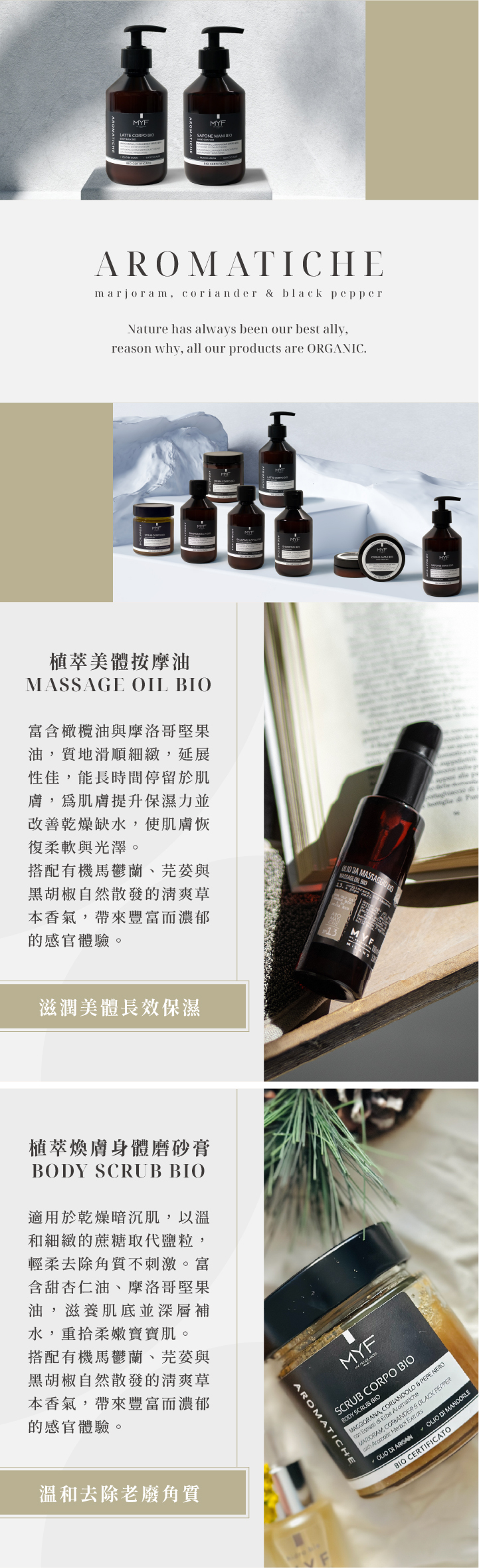 BIO植萃身體保養系列,以極為自豪的義大利風格與配方成分的嚴格篩選,追求使用自然原料來穩定肌膚護理。更以有機馬鬱蘭、芫荽和黑胡椒等古老藥草智慧為基礎,利用精油與天然植物香料的多種特性建立肌膚堅韌屏障。