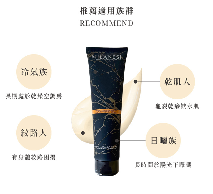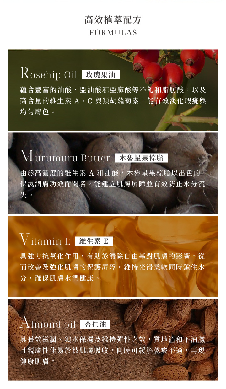 含玫瑰果油、乳木果油、摩洛哥堅果油與木魯星果棕脂等修護成分,立即滋養肌膚,使乾燥肌膚重新綻放水感,結合馬魯拉果仁油和婆羅樹脂達到潤澤保濕與改善粗糙現象,令肌膚如絲綢般柔滑。