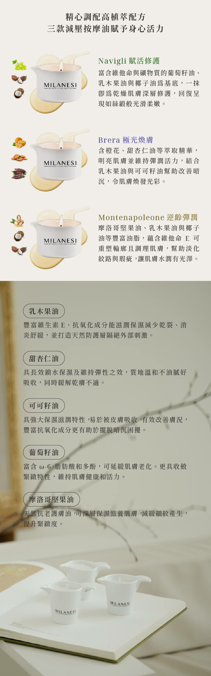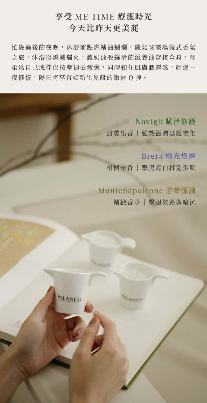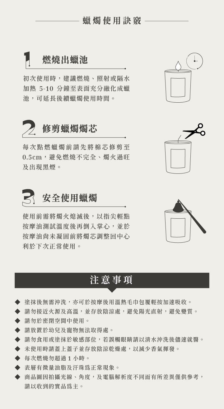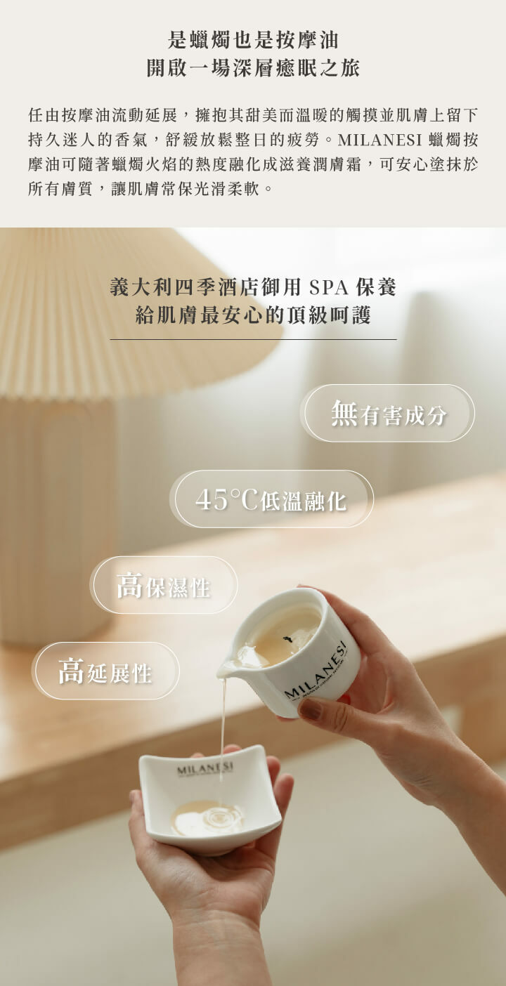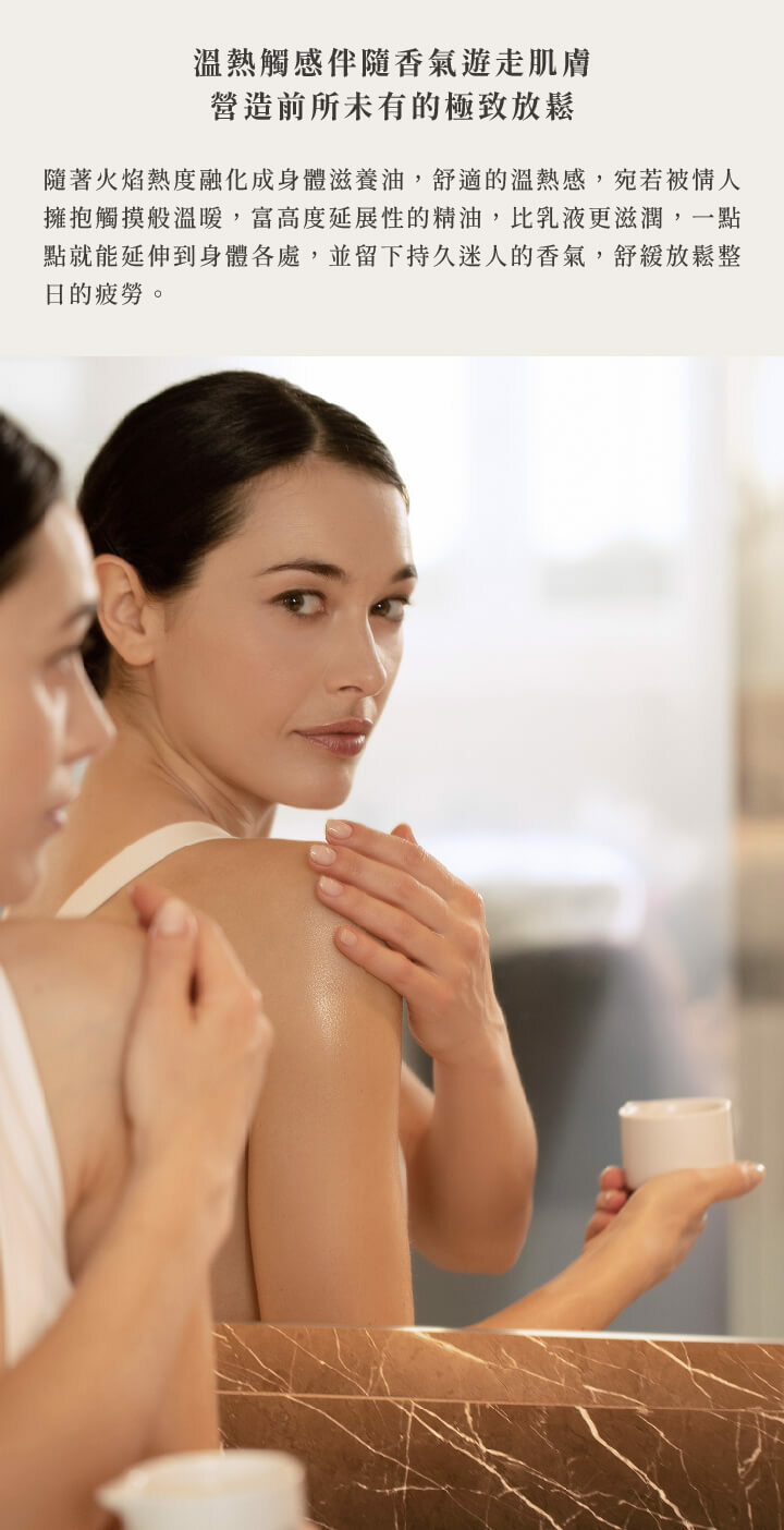 100%植物萃取精華油成分,質地如Cream般柔軟,本身隨著火焰的熱度融化成身體滋養油,塗抹於身上伴隨著舒服的溫熱感,似乎被情人擁抱溫暖般的觸摸,精油富有高度延展性,一點點就能延伸到身體各處,並留下持久迷人的香氣,舒緩放鬆整日的疲勞。